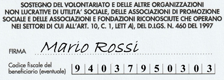 Donarci il 5x1000 è molto semplice. Basta firmare nel riquadro denominato “Sostegno del volontariato etc.” all’interno della dichiarazione dei redditi (Modello 730, o Redditi PF) e, sotto la firma, inserire il nostro codice fiscale che è