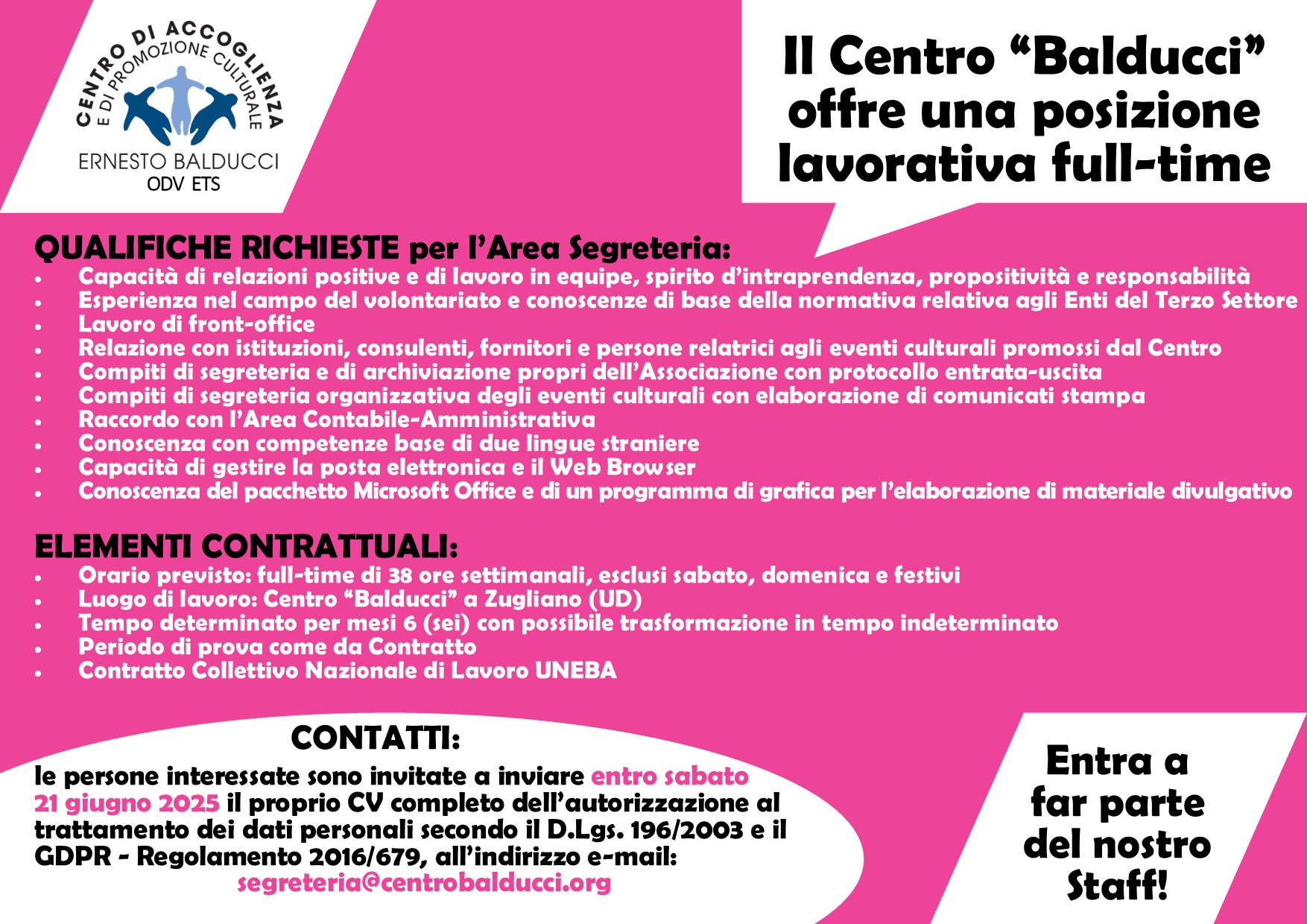 Contatti: le persone interessate sono invitate a inviare entro sabato 21 giugno 2025 il proprio CV completo dell'autorizzazione al trattamento dei dati personali secondo il D.Lgs. 196/2003 e il GDPR - Regolamento 2016/679, all'indirizzo email: segreteria@centrobalducci.org