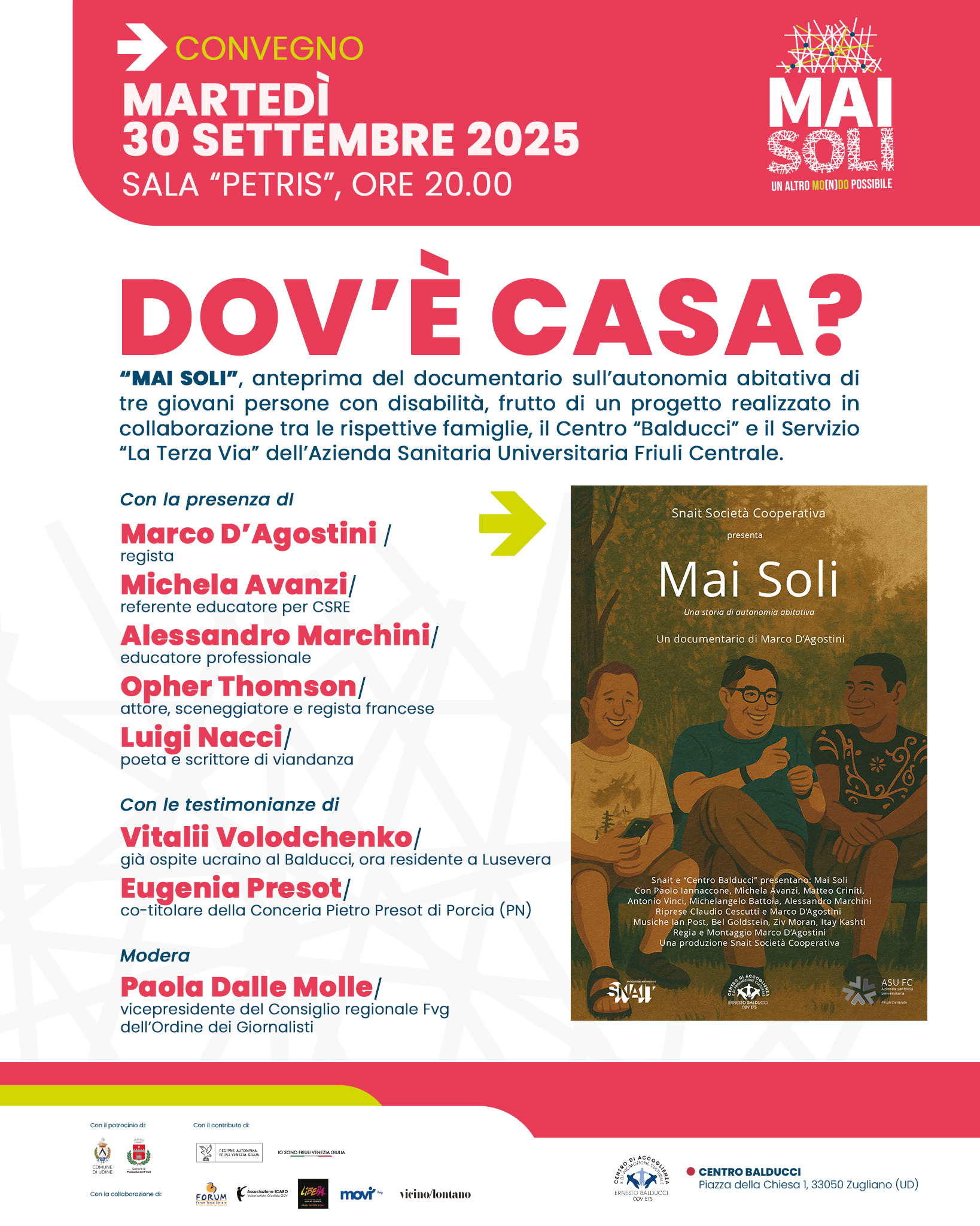 “Mai soli”, anteprima del documentario sull’autonomia abitativa di tre giovani persone con disabilità, frutto di un progetto realizzato in collaborazione tra le rispettive famiglie, il Centro “Balducci” e il Servizio “La Terza Via” dell’Azienda Sanitaria Universitaria Friuli Centrale.