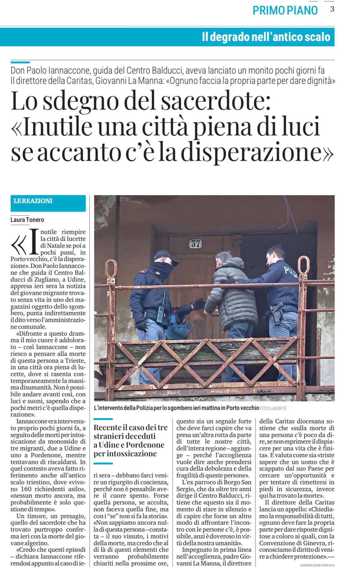 Laura Tonero, giornalista de Il Piccolo, ha intervistato Don Paolo lannaccone, presidente del Centro Balducci, in merito al ritrovamento in un capannone del Porto Vecchio del cadavere di un giovane migrante: "quarta persona - PERSONA, sottolinea don Paolo - morta in pochi giorni tra Trieste, Udine e Pordenone, durante l'emergenza freddo. Un dolore lacerante che non può lasciarci indifferenti, perché l'indifferenza è già violenza".