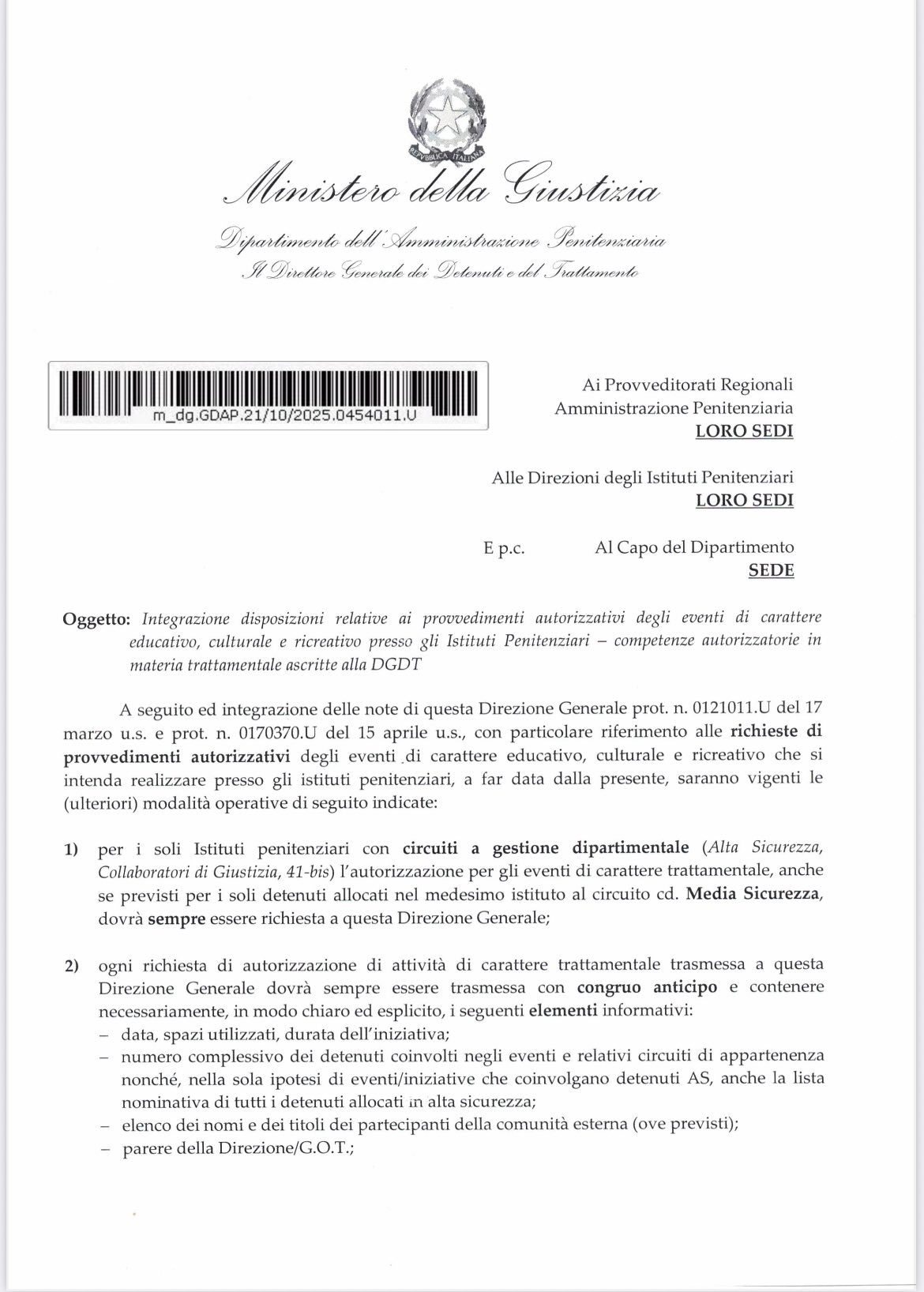 Particolare allarme desta la circolare n. 454011 del 21.10.2025 a firma del Direttore Generale dei detenuti e del trattamento, Ernesto Napollilo, con la quale si vuole incidere sulle richieste di provvedimenti autorizzativi da parte di personale esterno a svolgere - negli Istituti penitenziari — le attività finalizzate al reinserimento sociale dei condannati.