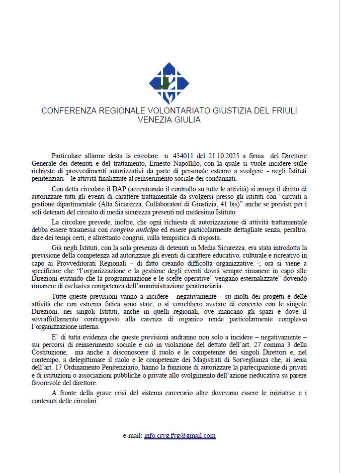 La Conferenza Regionale Volontariato Giustizia del Friuli Venezia Giulia esprime forte allarme per la circolare n. 454011 del 21 ottobre 2025, a firma del Direttore Generale dei detenuti e del trattamento, che introduce nuove restrizioni sulle autorizzazioni per le attività di reinserimento sociale nei penitenziari.