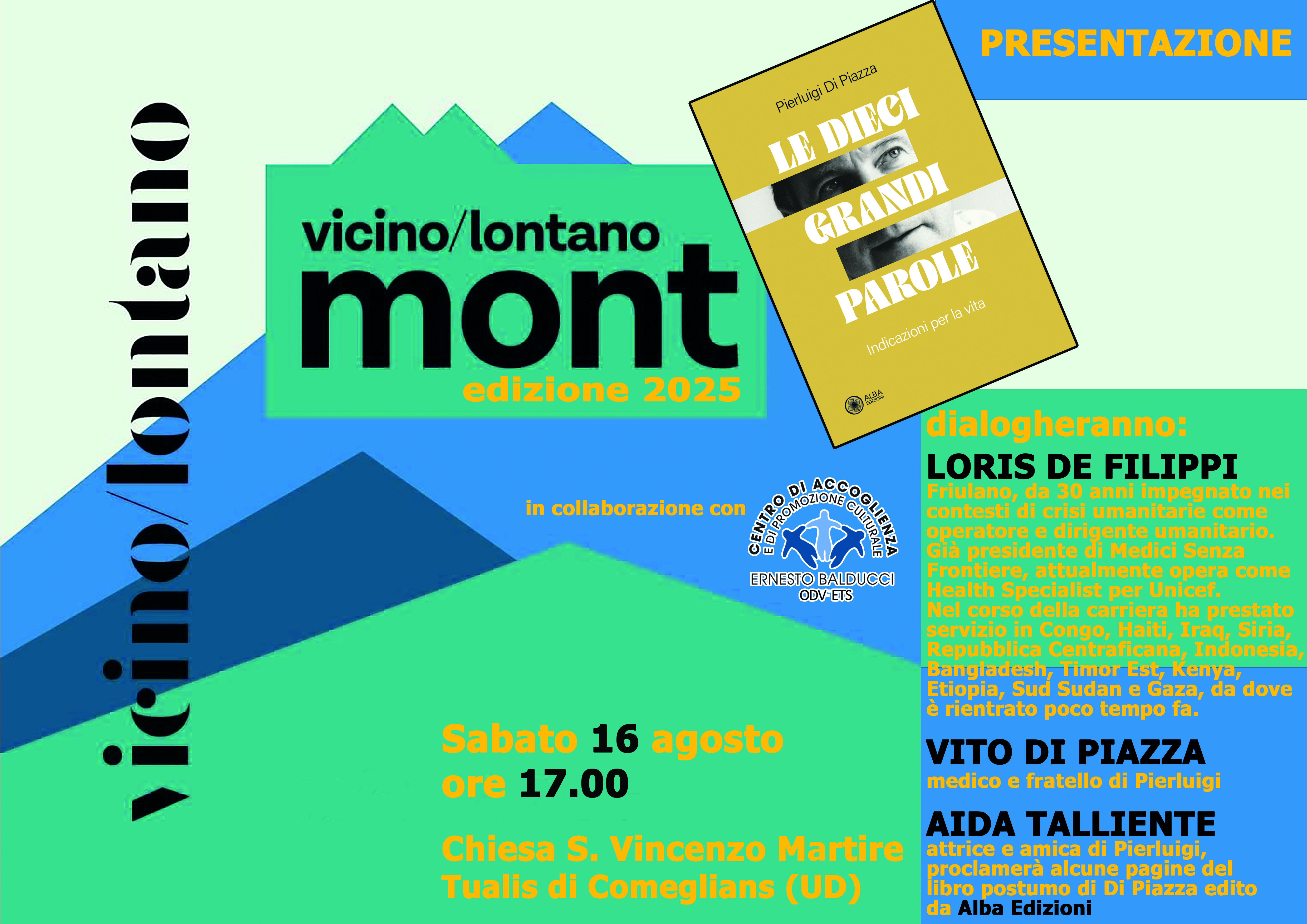 Nel corso dell'edizione 2025 di vicino/lontano mont, in collaborazione con il Centro Balducci, Leggimontagna e Ospiti in Arrivo, verrà presentato a Tualis l'ultimo libro di Pierluigi Di Piazza. Dialogheranno: Loris De Filippi, friulano, da 30 anni impegnato nei contesti di crisi umanitarie come operatore e dirigente umanitario. Già presidente di Medici Senza Frontiere, attualmente opera come Health Specialist per Unicef. Nel corso della carriera ha prestato servizio in Congo, Haiti, Iraq, Siria, Repubblica Centrafricana, Indonesia, Bangladesh, Timor Est, Kenya, Etiopia, Sud Sudan e Gaza, da dove è rientrato poco tempo fa. Vito di Piazza, medico e fratello di Pierluigi Aida Talliente, attrice e amica di Pierluigi, proclamerà alcune pagine del libro postumo di Pierluigi edito da Alba Edizioni. L'incontro si svolgerà sabato 16 agosto, alle ore 17.00 nella Chiesa di San Vincenzo Martire di Tualis di Comeglians (UD)