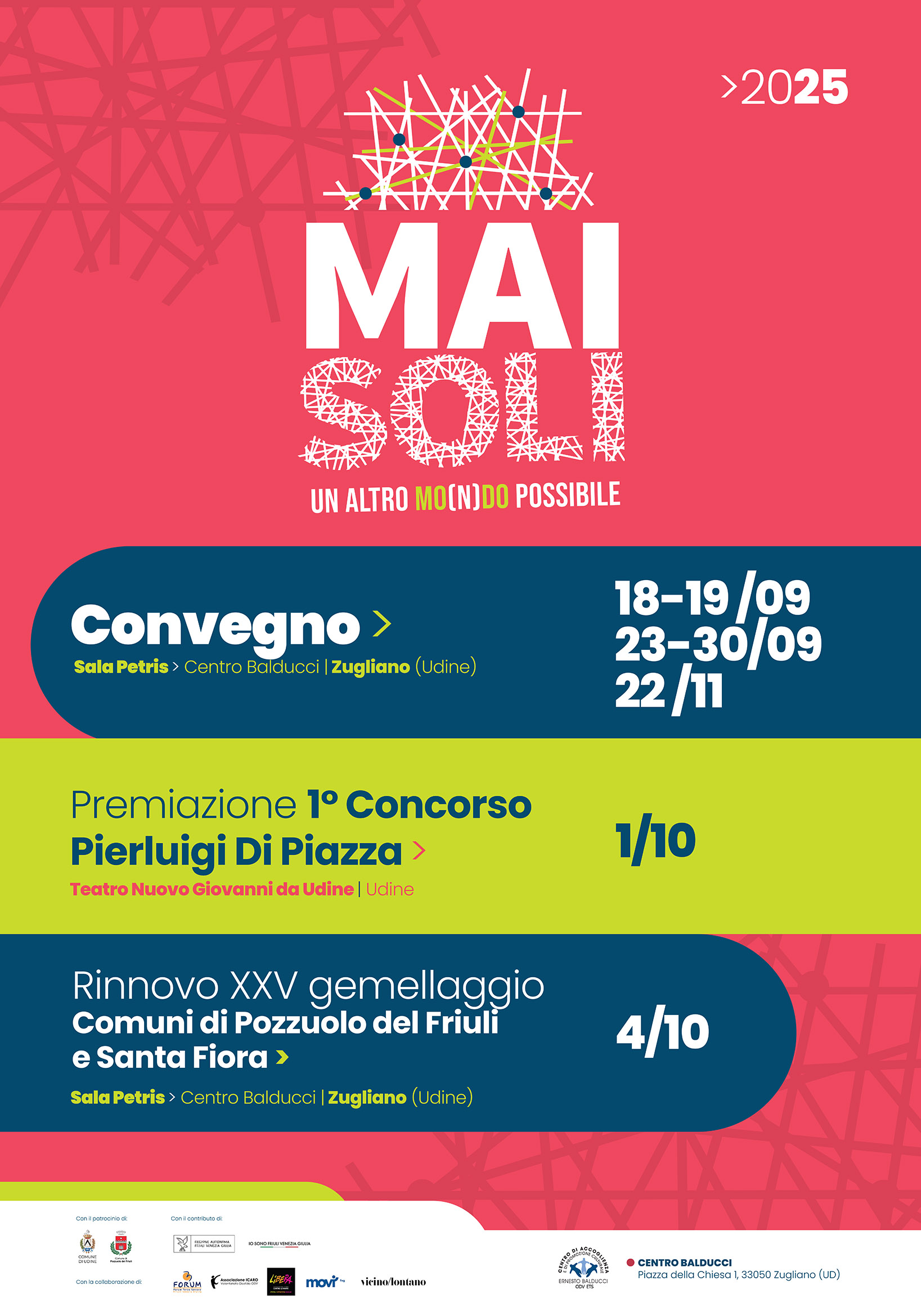 ------------------------------------ PROGRAMMA ANTEPRIMA Giovedì 18 settembre 2025 - Sala Petris. ore 20.30 SERATA D’INAUGURAZIONE DELLA MOSTRA «GABBIE E FACCE» - PITTURE 2020-2025 La mostra sarà visitabile nelle giornate del Convegno dal 19 al 30 settembre, sabato e domenica esclusi, dalle ore 16.00 alle 18.00 Tiziano Bravi, artista, dialoga con Giorgio Ganis, architetto e curatore delle sue Mostre Intermezzi con i poeti: Maurizio Benedetti, Sara Comuzzo, Massimiliano Lancerotto, Manuela Sallustio e Francesco Zorzenon Suoni di: Corrado Della Libera Tiziano Bravi è nato a Udine nel 1964. È un artista autodidatta che ha sempre dipinto, fin da ragazzo, spinto dalle pulsioni interiori, secondo la sua particolare sensibilità, prediligendo colori forti, che gli permettono di materializzare le sue idee e raccontare criticamente la sua vita: le sue illusioni, le sue speranze, i suoi sogni e le sue denunce verso una società che ritiene ipocrita. Le opere selezionate per questa mostra e già presentate a Trieste nella prestigiosa sede del Palazzo del Consiglio Regionale, realizzate con la tecnica dell’acrilico su tela, mettono in risalto non solo i colori, ma anche le parole, che sono una presenza costante in tutti i suoi lavori. Sono quadri che vanno letti, densi e stratificati, pieni di tempo. Attraverso le tele, caratterizzate da un segno vigoroso e istintivo, l’artista racconta l’uomo, indaga sulle persone, perché non ci sono più “volti”, ma solo “facce”. Il volto implica una sfera interiore, è l’espressione di un pensare autonomo e dinamico, mentre le “facce”, rappresentano qualcosa di esterno alla persona, che spesso la nasconde. “Faccia” significa gabbia, ossia chiusura mentale. “Gabbia” vuol dire che le persone, non riuscendo a ragionare con la propria testa, poiché vuota di valori e ideali, soggiogata dai social e dalla pubblicità, pensano collettivamente e dunque sono incapaci di sviluppare decisioni autonome. Le persone si sono dimenticate cosa vuol dire “amore”: non solo tra uomo e donna, ma verso l’umanità in generale, per gli animali e per il nostro meraviglioso pianeta. Sembra che la sofferenza altrui non tocchi più nessuno. Guerre, bambini che muoiono ancora oggi di fame, di sete, di violenza. La cosa principale è apparire per essere sempre più facce (gabbie) e non volti. Le opere esposte sono un invito a riprendere la rotta che questa società ha smarrito, tutti insieme, pensando. ------------------------- Venerdì 19 settembre 2025 Cinema Visionario - via Asquini 33, Udine, ore 20.00 (evento a pagamento) DA CITTÀ PERFETTA A ZONA DI SACRIFICIO: L’ACCIAIERIA ILVA E I GRAVI RISCHI PER SALUTE E AMBIENTE Visione in anteprima regionale del documentario-inchiesta “Taranto Chiama” (100’), “official selection” al CinemAmbiente - Environmental Film Festival 2025 di Torino e al Clorofilla Film Festival 2025 di Grosseto. Di Rosy Battaglia, giornalista d’inchiesta e documentarista, ideatrice di “Cittadini Reattivi”. Modera il dialogo con l’Autrice Flaviano Bosco, insegnante e saggista. In collaborazione con il Centro Espressioni Cinematografiche biglietti su www.visionario.movie e in cassa al cinema L’intento della regista con “Taranto chiama” è cercare di “ricostruire la solidarietà tra i popoli inquinati. Da Trieste, dove il 18 settembre 2022 è stata abbattuta la Ferriera, impianto altamente inquinante nel quartiere di Servola, a Taranto, dove il 7 maggio 2025 è andato a fuoco l’Altoforno 1 del Polo siderurgico Ilva, ora Acciaierie d’Italia, costruito a ridosso del quartiere di Tamburi. È tempo di indagare e raccontare per far comprendere cosa è sostenibile per la vita umana”. Il documentario restituisce con rigore giornalistico e potenza visiva la vicenda di una comunità ufficialmente riconosciuta “zona di sacrificio” dall’Organizzazione delle Nazioni Unite (ONU), con motivazioni gravissime, come ricordato nel film dallo stesso Commissario speciale al diritto ad un ambiente sano e sostenibile dell’ONU, Marcos A. Orellana. Taranto è oggetto di cinque condanne rivolte al Governo italiano dalla Corte europea dei Diritti dell’Uomo tra il 2019 e il 2022, per non aver tutelato il diritto alla vita privata dei propri cittadini, rispetto alla produzione di acciaio. Lo sguardo si posa sulle voci e i volti delle madri che lottano per la vita dei propri figli, dei medici impegnati a contrastare gli effetti dell’inquinamento sui bambini del quartiere Tamburi, di attivisti diventati “cacciatori di dati” per trasformare le prove scientifiche in battaglie civili, insieme agli avvocati impegnati a sostenere la tutela della salute pubblica e dell’ambiente, degli stessi operai impegnati a chiedere la riconversione. “Taranto chiama” è un racconto corale che ha dato origine all’inchiesta europea “Taranto, Sacrifice Zone” con il network investigativo CORRECTIV.Europe, pubblicata da Cittadini Reattivi nel 2024. Questa inchiesta ha appurato come, nel 2021, secondo i dati forniti dall’Agenzia Europea per l’Ambiente, il solo impianto siderurgico abbia causato danni per oltre un miliardo di euro, con un impatto significativo sulla mortalità e sulla qualità della vita degli abitanti. Costi che superano di gran lunga il Fondo per la Transizione Giusta (Just Transition Fund) destinato alla città, che ammonta a 795,6 milioni di euro. Martedì 23 settembre 2025 Sala “Petris”, ore 20.30, serata inaugurale MAI SOLI. UN ALTRO MO(N)DO POSSIBILE Saluti istituzionali Introduzione di Paolo Iannaccone, presidente del Centro “Balducci” Umberto Ambrosoli, figlio di Giorgio, assassinato nel 1979 Adriano Sofri, condannato a 22 anni di carcere quale mandante dell’omicidio Calabresi Linda Pocher, teologa e docente alla Pontificia Facoltà delle Scienze dell’educazione “Auxilium” di Roma Modera: Gianpaolo Carbonetto, giornalista e titolare del blog “Eppure…” ------------------------