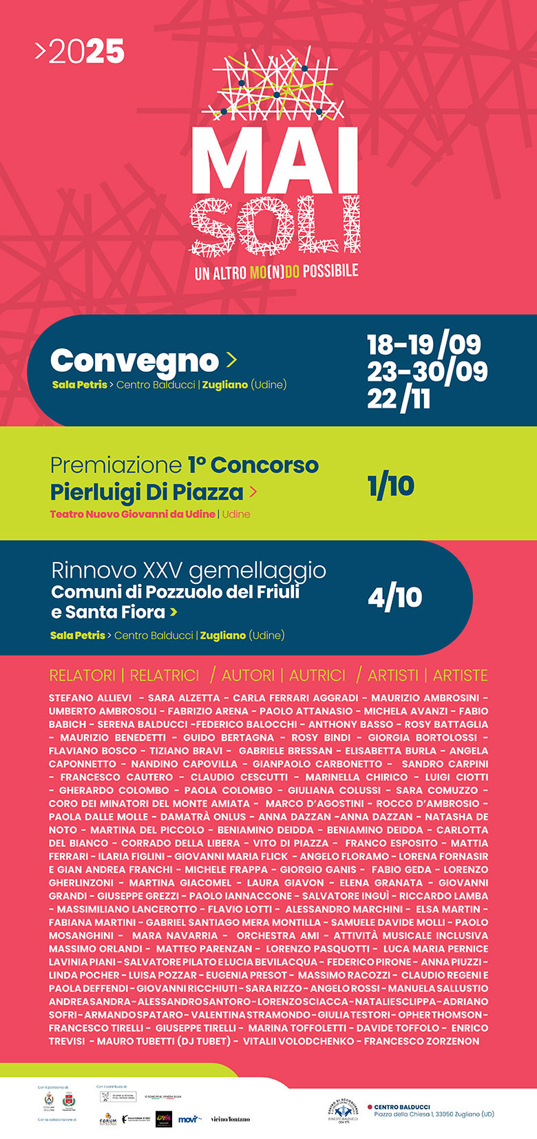 PRESENTAZIONE La solitudine è l’anima nascosta e segreta della vita. In un mondo collegato continuamente in ogni suo aspetto, essere in dialogo con la solitudine significa entrare in relazione con gli abissi della nostra interiorità, rappresenta l’occasione per scendere lungo i sentieri che portano dentro di sé e di ascoltare le ragioni della immaginazione e del cuore. Eppure come non avere la sensazione che oggi, in quella modernità che Eva Illouz definisce esplosiva, nel mondo della modernità esasperata e della comunicazione digitale, nella società gravemente polarizzata in cui la diversità fa problema, sia grande il rischio di naufragare nell’isolamento? Proprio l’isolamento, che allontana l’uno dall’altro, è il male oscuro della società. Nella solitudine almeno si rimane aperti al mondo e al desiderio di essere in relazione con gli altri, mentre è nell’isolamento che ci si chiude in sé stessi, nei confini della nostra soggettività, chiudendoci nel nostro mondo, distogliendoci dalla comunione e dalla solidarietà con il mondo degli altri. E l’isolamento può essere voluto, desiderato, cercato. Ma anche non voluto e non desiderato, quello che dilaga nelle nostre città, soprattutto nelle periferie, in condizioni di vita che la modernità continua senza fine a creare, lasciando indietro scarti di umanità. A partire da come vengono concepite le abitazioni e i nostri quartieri; per passare a come ci si chiude a chi, a partire da povertà materiali o umane, si trova escluso e marginalizzato; per arrivare a quelle “solitudini connesse”, come le chiama qualcuno, e che contribuiscono a desertificare le relazioni: una recente indagine afferma che incontriamo sempre meno i nostri amici e siamo sempre più lontani e distanti l’uno dall’altro. Come non pensare al campione di tennis Alexander Zverev, che dopo l’eliminazione al primo turno di Wimbledon, solo qualche mese fa, confessò «Mi sento solo nella vita in generale in questo momento… Faccio fatica a trovare la gioia fuori dal campo e mi sento molto, ma molto solo»? Come non pensare poi alla straziante solitudine di persone, che giungono da terre lontane, e alle loro sanguinanti ferite dell’anima? Come non prendere coscienza delle sconfinate sofferenze, che si associano a un isolamento generato dalle infelici condizioni di indifferenza e di ingiustizia sociale, in cui migranti e richiedenti asilo si trovano anche a causa di leggi inique? Come trovare il coraggio per non girarci dall’altra parte rispetto a coloro che vivono condizioni disumane nelle nostre carceri o, peggio ancora, nei CPR, per sovraffollamento, diritti negati o isolamento? Serve pertanto un ripensamento - al quale, nel nostro piccolo, vorremmo contribuire col presente Convegno - delle nostre filosofie, delle nostre politiche migratorie, sociali e urbanistiche, ridefinendo il modo di vivere la città e abitare i luoghi, come in alcune città europee si sta facendo da anni con frutti forieri di un futuro più umano che supera la cultura dello scarto. Ma serve anche il ripensamento del ruolo delle religioni, soprattutto in questo tempo molto complesso, contrassegnato da divisioni, guerre fratricide (una sessantina in atto nel mondo), genocidi che si consumano sotto gli occhi di tutti dietro un pressoché totale e complice silenzio dell’Occidente. Con la crescita di persone disconnesse, invisibili, dimenticate e non riconosciute dalla società – siano esse povere o ammalate, giovani o anziane, carcerate o migranti, senza lavoro o senza un tetto dove vivere –, la solitudine interpella anche la democrazia, perché, come lo scorso anno ha affermato Papa Francesco alle Giornate Sociali di Trieste, «l’indifferenza è il cancro della democrazia». Lo speciale anno giubilare che la Chiesa sta vivendo ci riporta poi a due dimensioni significative che, se attuate al di là di mere forme celebrative, potrebbero davvero rilanciare la speranza: l’economia solidale, capace di non lasciare indietro nessuno (a quando la remissione del debito dei Paesi più poveri per dar loro la possibilità di cominciare a rialzarsi?), e la liberazione da ogni forma di schiavitù (al Convegno parleremo in particolare del caporalato, presente anche nelle terre della nostra regione). Vorremmo però notare anche segni che ci permettano di guardare con fiducia al futuro: provengono da chi si appassiona al bene comune, dai giovani che, con la loro originalità, si spendono per la costruzione di città solidali, che non lasciano sole le persone: è l’esperienza del volontariato, dell’impegno nella politica, del trovare strade per servire l’uomo. Sono altri “modi” di vita, che danno origine a un altro “mondo possibile”. Come pensava Lorenzo Milani e che vogliamo diventi il motto del nostro Convegno: «Ho imparato che il problema degli altri è uguale al mio. Sortirne tutti insieme è politica. Sortirne da soli è avarizia». Paolo Iannaccone --------------- SEGRETERIA ORGANIZZATIVA Centro di Accoglienza e di Promozione culturale “Ernesto Balducci” ODV ETS Piazza della Chiesa, 1 - 33050 Zugliano (UD) Tel. 0432 560699 - email: segreteria@centrobalducci.org Gli eventi, tutti a ingresso libero a eccezione di quello programmato il 19 settembre 2025 e gestito dal Cinema “Visionario”, si terranno – salvo ove segnalato diversamente – presso la Sala “Mons. Luigi Petris” del Centro “Balducci”, a Zugliano (UD). È possibile partecipare – con versamento in loco di un libero contributo – a uno o a tutti i momenti conviviali offerti al pubblico dalle volontarie e dai volontari del Centro, alle ore 19.30 dei seguenti giorni: Mercoledì 24 settembre Sabato 4 ottobre e Sabato 22 novembre È richiesta la prenotazione, che si potrà fare compilando il form all'indirizzo https://forms.gle/4XTz8Gtq1mrD8Eh58 oppure inviando un’email alla Segreteria all'indirizzo segreteria@centrobalducci.org e indicando il numero dei partecipanti unitamente a