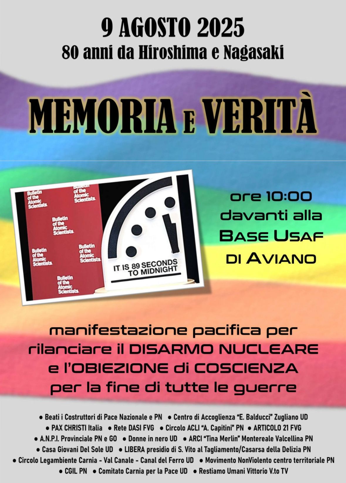 A quasi 30 anni dalla prima edizione si svolgerà sabato 9 agosto la commemorazione delle tragedie di Hiroshima e Nagasaki davanti alla Base USAF di Aviano, organizzata dal Tavolo per la Pace di Pordenone, coordinamento di associazioni, (tra cui il Centro Balducci), comitati e persone fisiche del Friuli Venezia Giulia e le province di Padova e Treviso.