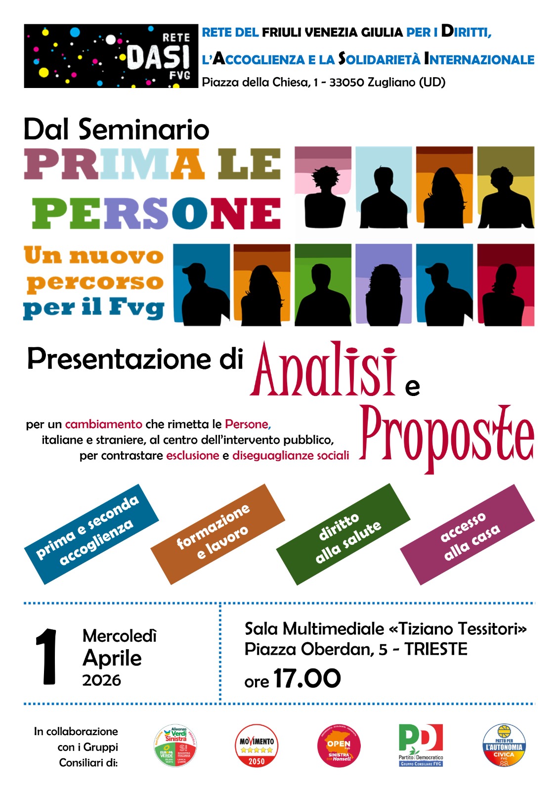 La RETE DASI FVG (Diritti, Accoglienza e Solidarietà Internazionale), a conclusione del Seminario "PRIMA LE PERSONE - Un nuovo percorso per il FVG", presenta Analisi e Proposte per un cambiamento che rimetta le persone, italiane e straniere, al centro dell'intervento pubblico, per contrastare esclusione e diseguaglianze sociali.