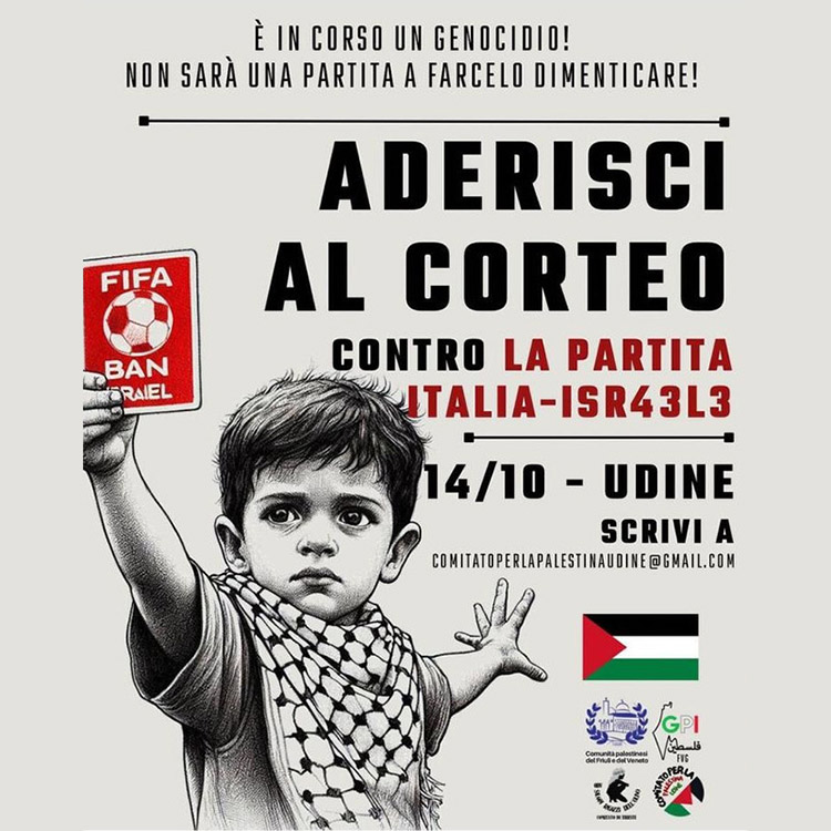 L’anno scorso, circa 3000 persone sono scese in strada a Udine per dimostrare la loro contrarietà alla partita di Nations League tra Italia-Israele del 14 ottobre 2024: quest’anno vogliamo essere ancora più numerosз per gridare che vogliamo Israele fuori dalla FIFA e il sionismo fuori dalla storia. Recentemente la campagna Show Israel the Red Card ha mostrato quanto possono essere forti e potenti le mobilitazioni di solidarietà nello sport. Non fermiamoci, continuiamo ancora a pretendere che le rappresentanze di Israele vengano estromesse da ogni competizione sportiva! Fuori Israele dalla FIFA e dall'Italia, fuori il sionismo dalla storia e dai nostri stadi! Show Israel the Red Card! Gli organizzatori: Comitato per la Palestina Udine, Comunità Palestinese FVG e Veneto, ODV Salaam Ragazzi dell'Olivo Comitato di Trieste, BDS Italia, Calcio e Rivoluzione